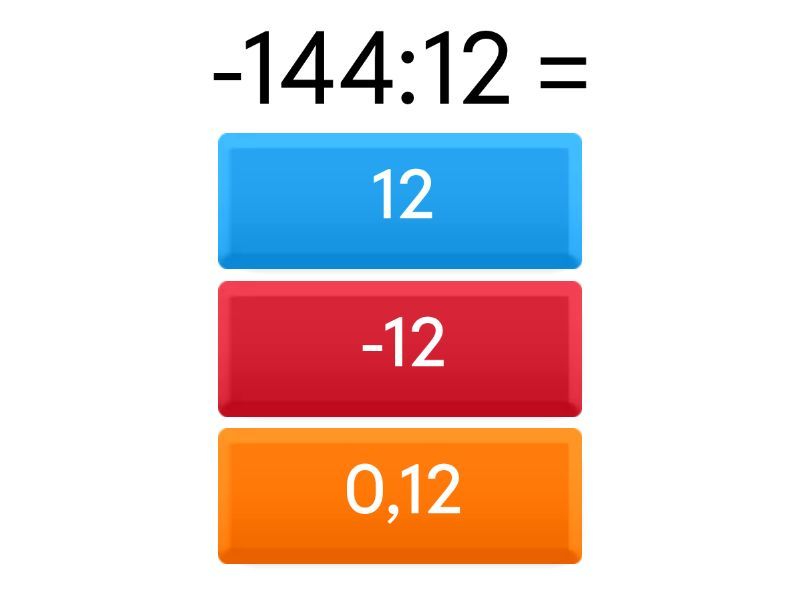 1) -144:12 = a) 12 b) -12 c) 0,12 2) 625:(-25) = a) -25 b) 25 c) -0.25 3) -5,1:(-17) = a) 3 b) -0,3 c) 0,3 4) -4,4:4 = a) -11 b) -1,1 c) 0,1 5) -8,6:(-4,3) = a) 0,2 b) -2 c) 2 6) 48,1:(-48,1) = a) 1 b) 0,1 c) -1 7) -950:9,5 = a) 100 b) -100 c) 10 8) -5,42:(-27,1) = a) -0,2 b) 2 c) 0,2 9) 10,01:(-1,3) = a) 77 b) -7,7 c) 7,7 10) 1484:(-7) a) -212 b) 212 c) 202