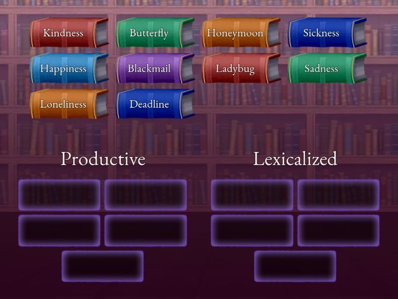 Productive: Happiness, Loneliness, Sickness, Kindness, Sadness, Lexicalized: Butterfly, Deadline, Honeymoon, Blackmail, Ladybug,