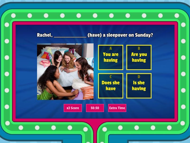 1) Rachel, ______________ (have) a sleepover on Sunday? a) You are having b) Are you having c) Does she have d) Is she having 2) Train for Lecce_________ (leave) at 2:30 pm. a) leaves b) are leaving c) is leaving d) leaving 3) All my friends ____________ (come) to my party next Thursday! a) coming b) come c) are coming d) is coming 4) My sister and I ___________ (visit) Paris next autumn. a) am visiting b) visit c) visiting d) are visiting 5) He ___________ (not meet) his friends at 10 pm. a) isn’t meeting b) doesn’t meet c) not meeting d) aren’t meeting  6) We _____________ (not have) maths twice a week. a) doesn’t have b) aren’t having c) don’t have d) aren’t haveing 7) My little brother often _________ (cry) when he’s hungry. a) crying  b) is crying c) cry d) cries 8) Hanna ___________ (travel) solo around Europe in June. It’s incredible! a) is travelling b) are travelling c) travelling d) travels 9) __________ (move) to Germany in 2023? No, he isn’t. a) Are you moving b) Is he moving c) Does he move d) Is he moveing 10) Our plane __________ (arrive) at 10 am tomorrow morning. a) is arriving b) arrive c) arrives d) arriving 11) Come on! Shut up! The film ________ (start)! a) is starting b) starting c) start d) starts 12) The new art exhibition ___________ (open) on 22nd February and ___________ (finish) on 30th June. a) opens/is finishing b) is opening/is finishing c) opening/finishing d) opens/finishes 13) Mum _________ (go) to the supermarket this afternoon. a) goes b) is going c) go d) going 14) Well, my mother usually _____________ (not work) on Mondays. a) doesn’t work b) isn’t working c) don’t work d) doesn’t working 15) Hurry up people! We __________ (close) in ten minutes. a) closing  b) closes c) are closing d) close 16) I ___________ English at 10.00 next Monday. a) having b) have c) has d) had