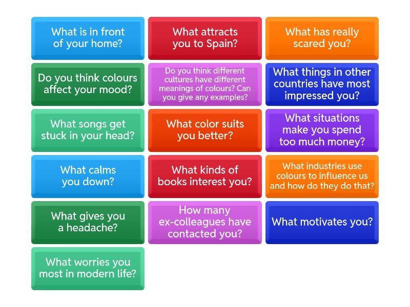 Do you think colours affect your mood?, How many ex-colleagues have contacted you?, What attracts you to Spain?, What calms you down?, What gives you a headache?, What has really scared you?, What is in front of your home?, What kinds of books interest you?, What motivates you?, Do you think different cultures have different meanings of colours? Can you give any examples?, What situations make you spend too much money?, What songs get stuck in your head?, What industries use colours to influence us and how do they do that?, What things in other countries have most impressed you?, What worries you most in modern life?, What color suits you better?,