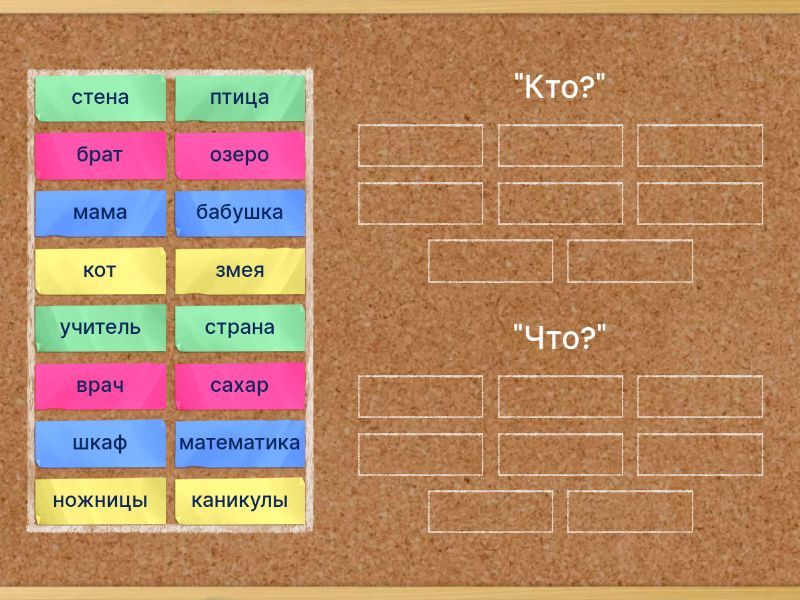 "Кто?": кот, учитель, птица, змея, врач, мама, брат, бабушка, "Что?": шкаф, каникулы, стена, сахар, ножницы, математика, озеро, страна,