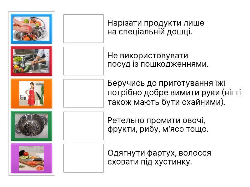 Беручись до приготування їжі потрібно добре вимити руки (нігті також мають бути охайними)., Одягнути фартух, волосся сховати під хустинку., Ретельно промити овочі, фрукти, рибу, м’ясо тощо., Нарізати продукти лише на спеціальній дошці., Не використовувати посуд із пошкодженнями.,
