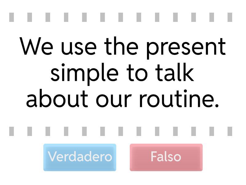 Verdadero: We use the present simple to talk about our routine., We use the present simple to talk about our hobbies., We use the present simple to talk about our job., We use the present simple to talk about our skills and abilities., We use the present simple to talk about schedules., We use the present simple to talk about permanent situations., We use the present simple to talk about science., Falso: We use the present simple to talk about an action happening now., We use the present simple to talk about plans., We use the present simple to talk about temporary situations.,