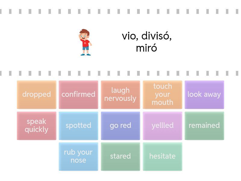 spotted - vio, divisó, miró, confirmed - confirmó, dropped - dejó caer, remained - se quedó permaneció, yellled - gritó, go red - ponerse rojo, hesitate - dudar, vacilar, laugh nervously - reír nerviosamente, look away  - desviar la mirada, rub your nose - frotarse la nariz con la mano, speak quickly - hablar rápido, touch your mouth - tocarse la boca, stared - miró fijamente,
