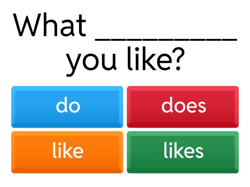 1) What _________ you like? a) do b) does c) like d) likes 2) I ____________ balloons. a) likes b) like c) do d) does 3) I __________ like nuts. ❌ a) does b) do c) doesn´t d) don´t 4) What _________ he like? a) does b) do c) likes d) like 5) What does he _____________? a) like b) likes c) does d) doesn´t 6) He _________ sweets. a) like b) does c) do d) likes 7) I _________ like presents.  ❌ a) doesn´t b) like c) do not d) does not 8) He __________ like his neighbour. ❌ a) does b) doesn´t c) do d) likes 9) She _________ her card. a) I b) does c) likes d) like 10) Do you _________ nuts? a) like b) likes c) do d) does 11) Does he ________ pastries? a) like b) likes c) doesn´t d) don´t 12) _______ you like your mum? a) Does b) Do c) Like d) Likes 13) ____________ she like her present? a) Likes b) Like c) Do d) Does 14) Does _____ like grapes? a) you b) I c) we d) she 15) Do ______ like my tie? a) you b) she c) he d) it
