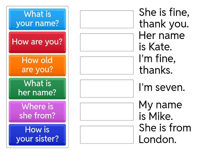 What is your name? - My name is Mike., How old are you? - I’m seven., Where are you from? - I am from Britain., How are you? - I’m fine, thanks., Who is he? - He is my father., What is his name? - His name is Nick., Where is he from? - He is from Minsk., How is your father? - He is fine, thank you., Who is she? - She is my sister., What is her name? - Her name is Kate., Where is she from? - She is from London., How is your sister? - She is fine, thank you.,