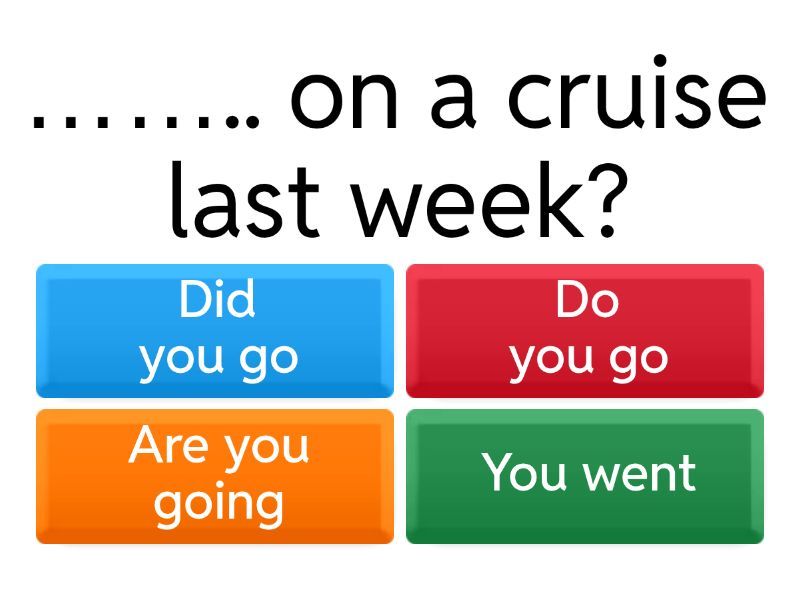 1) …….. on a cruise last week? a) Did you go b) Do you go c) Are you going d) You went 2) We …….. to rent a house by the sea, but it was too expensive. a) tryied b) tryd c) tried d) tries 3) Last year we …….. a wonderful time when we stayed by the sea! a) have b) are having c) haved d) had 4) We …….. in a cottage in the mountains. a) used to live b) would living c) live d) didn’t lived 5) We….. on the way to the hotel yesterday to book our bus tickets. a) stop b) are stopping c) stopped d) stoped 6) The girls…….. to walk, so they rented bikes to travel around the island. a) didn’t wanted b) didn’t want c) aren’t wanting d) doesn’t want 7) My aunt drives a …….. car. a) fantastic, small, red b) red, fantastic, small c) small, fantastic, red d) fantastic, red, small 8) My dad…….. to the village yesterday; it was a long trip and the road was bumpy. a) drives b) drove c) used to drive d) is driving 9) My brother …….. his passport, so he missed his flight. a) loses b) losed c) is losing d) lost 10) Where …….. when you visited Germany last year? a) do you stay b) did you stay c) are you staying d) does you stay 11) Adam's parents have a …….. puppy. a) young, playful, brown b) B playful, young, brown c) C young, brown, playful d) D brown, young, playful 12) We visited Australia two years ……... It was an amazing trip! a) then b) last c) now d) ago 13) Did your parents go on a skiing holiday ……..? a) last month b) every month c) ago d) at the moment 14) Did you …….. to go on holiday with your grandparents when you were six years old? a) used b) using c) use d) uses 15) My friend …….. a dog when he was younger. a) did had b) would have c) has d) used to have 16) We travelled in a …….. boat and enjoyed the sea. a) beautiful, white, new b) B beautiful, new, white c) C white, beautiful, new d) D new, white, beautiful 17) We …….. in a hotel near the city centre on our trip to Milan last month. a) stays b) is staying c) stayed d) stay 18) What time …….. your uncle leave for the airport yesterday? a) does b) is c) did d) do