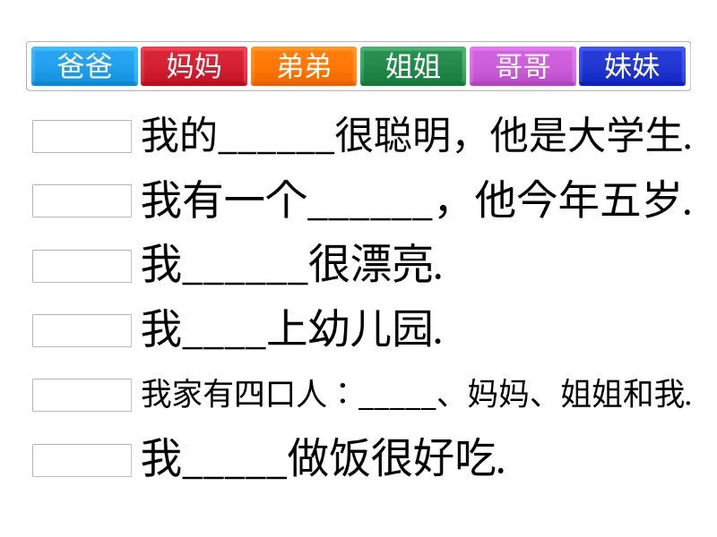 爸爸 - 我家有四口人:_____、妈妈、姐姐和我., 妈妈 - 我_____做饭很好吃., 哥哥 - 我的______很聪明,他是大学生., 弟弟 - 我有一个______,他今年五岁., 妹妹 - 我____上幼儿园., 姐姐 - 我______很漂亮.,