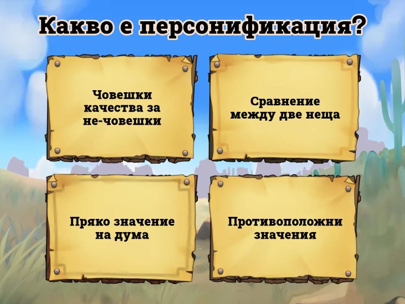 1) Какво е персонификация? a) Човешки качества за не-човешки b) Сравнение между две неща c) Пряко значение на дума d) Противоположни значения 2) Кое изречение съдържа персонификация? a) Котката мърка b) Дървото танцува c) Книгата е стара d) Реката е дълга 3) Кое е пример за персонификация? a) Слънцето се усмихва b) Котката е бърза c) Къщата е голяма d) Птицата лети 4) Каква е разликата между метафора и персонификация? a) Персонификацията дава човешки качества b) Метафората е сравнение c) Метафората е буквална d) Персонификацията е сравнение 5) Какво означава изразът 'вятърът шепне'? a) Вятърът е тих b) Вятърът издава звуци c) Вятърът е силен d) Вятърът е студен 6) Коя от следните фрази е персонификация? a) Реката пее b) Котката скача c) Книгата е интересна d) Птицата лети 7) Какво прави персонификацията в литературата? a) Оживява текста b) Усложнява текста c) Прави текста по-кратък d) Прави текста по-формален 8) Коя от следните е персонификация? a) Луната се усмихва b) Котката е черна c) Дървото е високо d) Реката е дълбока 9) Какво е ефектът от използването на персонификация? a) Прави речта по-жива b) Прави речта по-сложна c) Прави речта по-кратка d) Прави речта по-формална 10) Кое изречение е пример за персонификация? a) Звездите танцуват b) Котката е бърза c) Книгата е стара d) Птицата лети