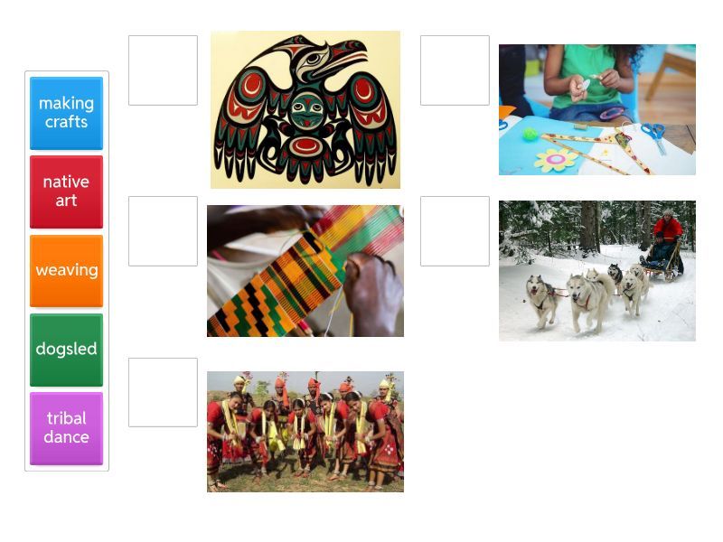 dogsled, making crafts, native art, weaving, tribal dance ,