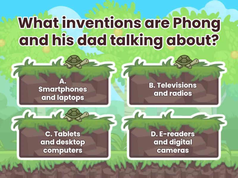 1) What inventions are Phong and his dad talking about? a) A. Smartphones and laptops b) B. Televisions and radios c) C. Tablets and desktop computers d) D. E-readers and digital cameras 2) How useful are laptops according to the conversation? a) A. They are only useful for playing games b) B. They are essential for professional work but not education c) C. They are portable and can be used anywhere d) D. They are becoming obsolete compared to smartphones 3) Why is it fun and convenient to learn with educational apps on smartphones? a) A. Because they allow students to cheat on tests b) B. Because they can be used anywhere and anytime c) C. Because they eliminate the need for teachers d) D. Because they are free and don't require internet connection 4) Which feature of modern technology is emphasized in the conversation between Phong and his dad? a) A. The entertainment value b) B. The high cost c) C. The educational benefits d) D. The negative social impacts