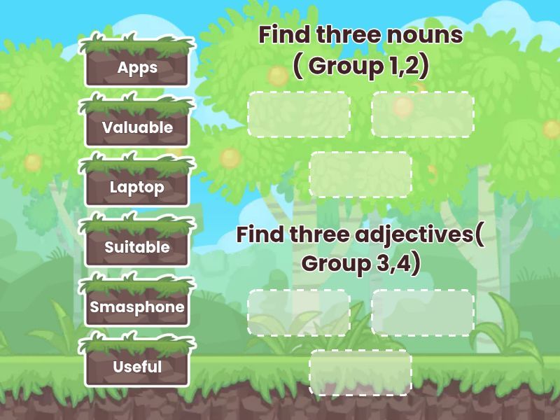 Find three nouns ( Group 1,2): Laptop, Apps, Smasphone, Find three adjectives( Group 3,4): Useful, Suitable, Valuable,