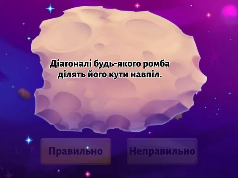 Правильно: Діагоналі будь-якого ромба ділять його кути навпіл., Діагоналі будь-якого квадрата перпендикулярні, Середня лінія трапеції паралельна її основам, Серединний перпендикуляр, проведений до сторони рівностороннього трикутника, поділяє його на дві рівних трикутника, У прямокутному трикутнику серединні перпендикуляри, проведенні до його катетів, перетинаються в точці, що є серединою гіпотенузи, Кінці діаметра ділять коло на дві рівні частини, Неправильно: Діагоналі будь-якого чотирикутника точкою перетину діляться навпіл, Середня лінія трапеції ділить трапецію на рівні за площею фігури., Точка перетину серединних перпендикулярів у тупокутному трикутнику  , Середня лінія трапеції дорівнює півсумі її бічних сторін розташована всередині трикутника, Рівні хорди кола стягують рівні дуги, Будь-яка хорда кола більша за радіус цього кола,
