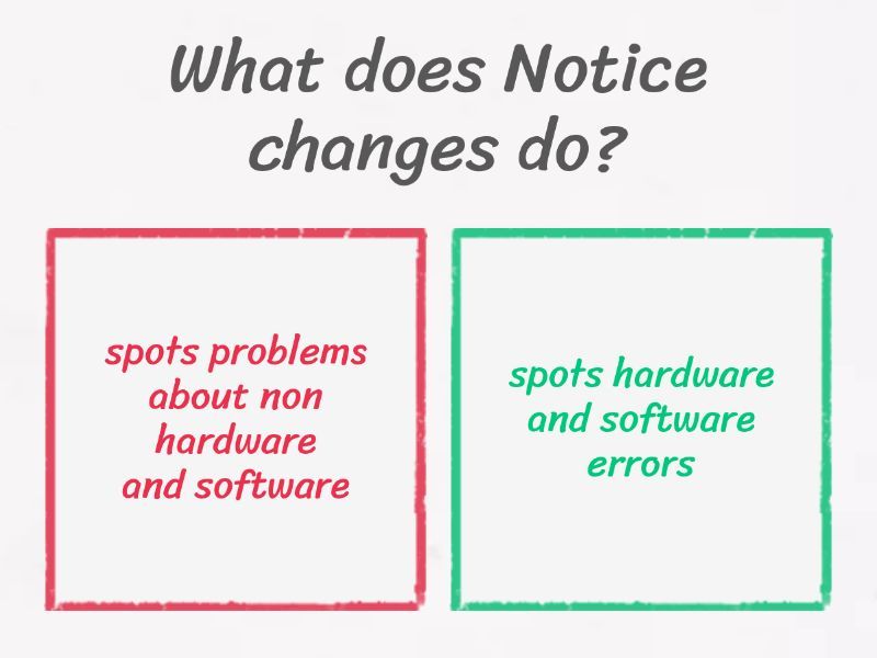 1) What does Notice changes do? a) spots problems about non hardware and software b) spots hardware and software errors 2) Hardware Checks are...? a) performance reliability functionality b) Inefficiency Inconsistency Inability 3) What is PC diagnosing method? a) OVERLOOKING/IGNORING THE PROBLEMS TO THE COMPUTER'S HARDWARE, SOFTWARE, OR NETWORK TO NOT FIND A SOLUTION TO THAT. b) IDENTIFYING/ANALYZING PROBLEMS WITH A COMPUTER'S HARDWARE, SOFTWARE, OR NETWORK TO DETERMINE THE ROOT CAUSE OF THE ISSUE 4) Event viewer findings a) finding faulty component computer b) Finding error or warning associated with faulty hardware or software 5) Is check cables literally just checking cables? a) yeah?? You need to check cables such as data cables and power cables, etc. b) no, you also need to check errors and all that stuff