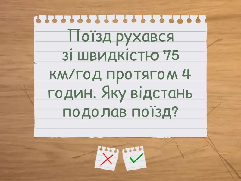 Пішохід ішов зі швидкістю 5 км/год протягом 3 годин. Яку відстань він подолав? - 15 км, Поїзд рухався зі швидкістю 75 км/год протягом 4 годин. Яку відстань подолав поїзд? - 300 км, Велосипедист їхав зі швидкістю 24 км/год протягом 5 годин. Яку відстань він подолав? - 120 км, Турист ішов зі швидкістю 7 км/год упродовж 6 годин. Яку відстань він пройшов? - 42 км, Катер плив зі швидкістю 48 км/год протягом 3 годин. Яку відстань він подолав? - 138 км, Хлопчик біжить зі швидкістю 4 м/с. Скільки метрів він подолає за 20 секунд? - 80 м, Велосипедист рухається зі швидкістю 15 км/год. Яку відстань він подолає за 4 год? - 60 км, Потяг рухається зі швидкістю 70 км/год протягом 3 год. Скільки кілометрів він проїде? - 210 км, Спортсмен біг зі швидкістю 12 км/год і тренувався 2 години. Яку дистанцію він пробіг? - 24 км, Каякер плив зі швидкістю 8 км/год протягом 4 годин. Яку відстань він проплив? - 32 км,