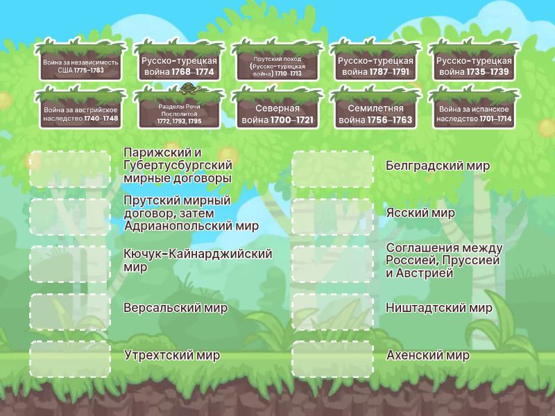 Северная война 1700–1721 - Ништадтский мир , Война за испанское наследство 1701–1714 - Утрехтский мир, Прутский поход (Русско-турецкая война) 1710–1713 - Прутский мирный договор, затем Адрианопольский мир, Русско-турецкая война 1735–1739 - Белградский мир, Война за австрийское наследство 1740–1748 - Ахенский мир, Семилетняя война 1756–1763 - Парижский и Губертусбургский мирные договоры, Русско-турецкая война 1768–1774 - Кючук-Кайнарджийский мир, Война за независимость США 1775-1783 - Версальский мир, Русско-турецкая война 1787–1791 - Ясский мир, Разделы Речи Посполитой 1772, 1793, 1795 - Соглашения между Россией, Пруссией и Австрией,