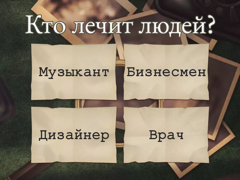 1) Кто лечит людей? a) Музыкант b) Бизнесмен c) Дизайнер d) Врач 2) Кто проектирует здания? a) Пилот b) Повар c) Инженер d) Гид 3) Кто создает репортажи? a) Банкир b) Актёр c) Журналист d) Психолог 4) Кто играет в кино и театре? a) Футболист b) Курьер c) Поэт d) Актёр 5) Кто преподаёт в университете? a) Повар b) Музыкант c) Бизнесмен d) Преподаватель 6) Кто пилотирует самолёт? a) Пилот b) Инженер c) Поэт d) Дизайнер 7) Кто создает музыку? a) Банкир b) Психолог c) Гид d) Музыкант 8) Кто ведет бизнес? a) Актёр b) Повар c) Футболист d) Бизнесмен 9) Кто изучает биологию? a) Курьер b) Журналист c) Пилот d) Биолог 10) Кто создает дизайн? a) Врач b) Поэт c) Дизайнер d) Музыкант 11) Кто готовит еду? a) Футболист b) Банкир c) Актёр d) Повар 12) Кто занимается футболом? a) Гид b) Футболист c) Поэт d) Психолог 13) Кто пишет стихи? a) Инженер b) Курьер c) Поэт d) Преподаватель 14) Кто работает в банке? a) Дизайнер b) Банкир c) Музыкант d) Футболист 15) Кто доставляет посылки? a) Актёр b) Повар c) Биолог d) Курьер 16) Кто изучает психологию? a) Психолог b) Гид c) Пилот d) Журналист 17) Кто проводит экскурсии? a) Врач b) Поэт c) Гид d) Бизнесмен 18) Кто следит за порядком? a) Повар b) Инженер c) Полицейский d) Музыкант 19) Кто работает с деньгами? a) Курьер b) Банкир c) Футболист d) Дизайнер 20) Кто занимается спортом? a) Футболист b) Актёр c) Журналист d) Психолог