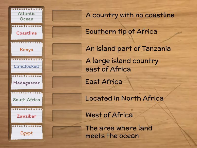 South Africa - Southern tip of Africa, Egypt - Located in North Africa, Nigeria - West Africa, Kenya - East Africa, DRC (Congo) - Central Africa , Morocco - Near the Mediterranean Sea , Indian Ocean - East of Africa, Atlantic Ocean - West of Africa, Southern Ocean - South of Africa , Madagascar - A large island country east of Africa , Zanzibar - An island part of Tanzania , Landlocked - A country with no coastline , Equator - An imaginary line across the middle of Earth, Coastline - The area where land meets the ocean , Border - A line separating two countries ,