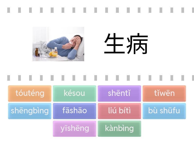 shēngbìng - 生病, liú bítì - 流鼻涕, tóuténg - 头疼, kànbìng - 看病, yīshēng - 医生, fāshāo - 发烧, késou - 咳嗽, tǐwēn - 体温, shēntǐ - 身体, bù shūfu - 不舒服,