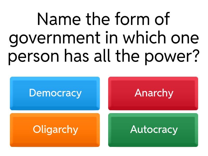 1) Name the form of government in which one person has all the power? a) Democracy b) Anarchy c) Oligarchy d) Autocracy 2) In a _______ a king or queen rules the country. a) Democracy b) Oligarchy c) Monarchy d) Anarchy 3) A _________ is a form of government where one leader has absolute control over citizens’ lives a) Democracy b) Dictatorship c) Anarchy d) Oligarchy 4) Which form of government can coexist with a monarchy? a) Theocracy b) Anarchy c) Oligarchy d) Dictatorship 5) A monarchy can be like a _________ or it can be limited by a constitution and be part of a democracy. a) Democracy b) Anarchy c) Oligarchy d) Dictatorship 6) A direct democracy exists when… a) the will of the people is translated by representatives into law directly by the people themselves b) the will of the people is translated by the executive branch of governmenrt c) the people participate and vote on all issues themselves d) None of the above 7) Elected leaders or representatives do the day to day work of governing the country; they consider the issues, work to find solutions and pass laws and do all of the other things necessary to keep a country going. Citizens hold the ultimate power though, because if they don’t like what the representatives are doing, they can vote in new ones. Name the form of government described above. a) Dictatorship b) Oligarchy c) Democracy d) Representative Democracy 8) Name the form of government that is a Greek word, meaning, “rule by a few.” a) Dictatorship b) Oligarchy c) Democracy d) Republic 9) When a small group of military leaders who rule a country after taking it by force the oligarchy is called a __________. a) Junior b) Jesuit c) Junta d) None of the above 10) Name the form of government that recognizes God or a divine being as the ultimate authority. a) Theocracy b) Oligarchy c) Junta d) Democracy 11) Name the human state of existence before any governments developed. a) Democracy b) Oligarchy c) Anarchy d) Monarchy 12) This is when 2 different cultures separate further from one another a) Convergence b) Divergence c) Diffusion 13) This is when 2 different cultures become more similar with one another: a) Convergence b) Divergence c) Diffusion 14) This is the spreading out of the ideology of a culture over an area: a) Convergence b) Divergence c) Diffusion