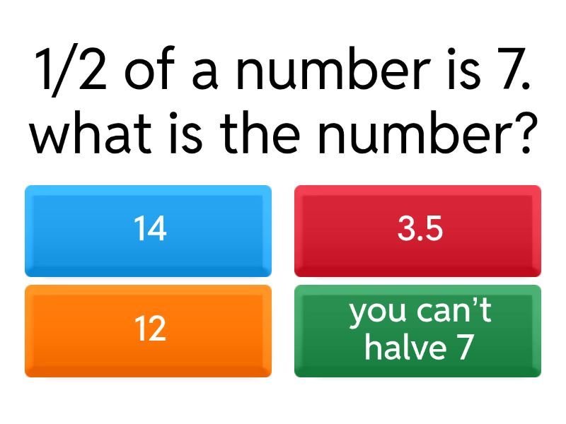 1) 1/2 of a number is 7. what is the number? a) 14 b) 3.5 c) 12 d) you can’t halve 7 2) 1/3 of a number is 3. What is the number? a) 1 b) 9 c) 13 d) 3 3) 1/4 of a number is 8. What is the number? a) 4 b) 8 c) 32 d) 16 4) 1/5 of a number is 9. What is the number? a) 5 b) 9 c) 45 d) 49 5) 2/3 of a number is 12. What is the number? a) 8 b) 18 c) 4 d) 24 6) 2/5 of a number is 10. What is the number? a) 4 b) 2 c) 25 d) 20 7) 2/3 of a number is 3. What is the number? a) 2 b) 4.5 c) 9 d) 6 8) a number is increase by 1/3 to 16. What is the number? a) 1 b) 2 9) a number is increase by 1.5 to 36. What is the number? a) 1 b) 2 10) a number is increase by 1/4 to 21. What is the number? a) 1 b) 2