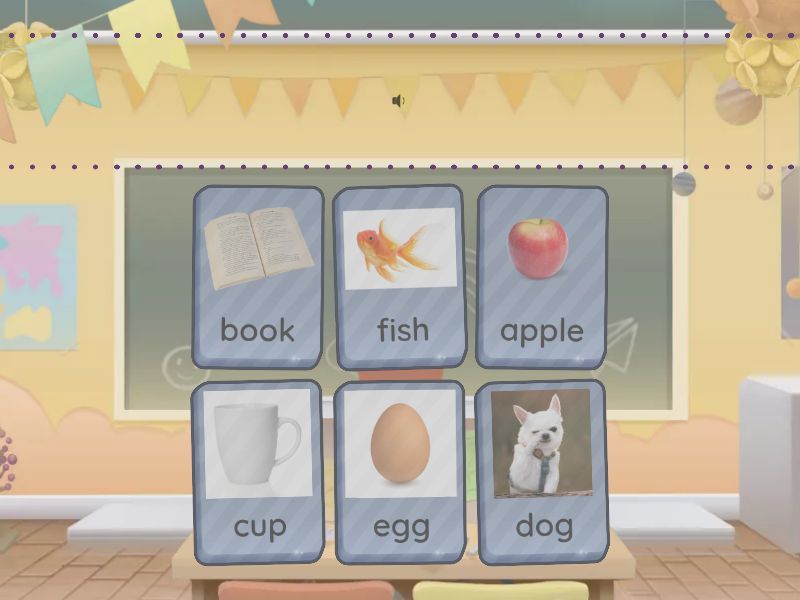 apple, book, cup, dog, egg, fish,