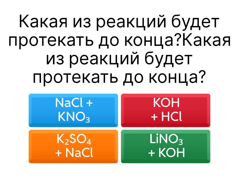 1) Какая из реакций будет протекать до конца?Какая из реакций будет протекать до конца? a) NaCl + KNO₃ b) KOH + HCl c) K₂SO₄ + NaCl d) LiNO₃ + KOH 2) Укажите сокращённое ионное уравнение реакции: Na₂CO₃ + 2HCl → ? a) CO₃²⁻ + 2H⁺ → H₂O + CO₂↑ b) Na⁺ + Cl⁻ → NaCl c) CO₂ + H₂O → H₂CO₃ d) 2Na⁺ + 2Cl⁻ → 2NaCl 3) В каких случаях реакция идёт до конца из-за образования газа? a) FeS + 2HCl b) NaOH + HCl c) BaCl₂ + Na₂SO₄ d) CaCO₃ + 2HCl 4) Какое вещество является слабым электролитом? a) NaCl b) HNO₃ c) H₂O d) KOH 5) Какой продукт образуется при взаимодействии Na₂S и CuSO₄? a) S↑ b) CuS↓ c) Cu(OH)₂↓ d) NaOH 6) Какая реакция НЕ является реакцией обмена? a) Cu + 2AgNO₃ b) FeS + 2HCl c) AgNO₃ + NaCl d) H₂SO₄ + Ba(OH)₂ 7) В каких уравнениях образуется нерастворимое основание? a) Cu²⁺ + 2OH⁻ → Cu(OH)₂↓ b) Fe³⁺ + 3OH⁻ → Fe(OH)₃↓ c) Ba²⁺ + 2OH⁻ → Ba(OH)₂ d) Al³⁺ + 3OH⁻ → Al(OH)₃↓ 8) Выберите реакции, которые НЕ будут идти в растворе? a) Na₂SO₄ + BaCl₂ b) KCl + NaNO₃ c) NaNO₃ + K₂SO₄ d) Li₂SO₄ + NaOH 9) Какие ионы сокращаются (не входят в итоговое ионное уравнение) при реакции KOH + HCl? a) K⁺ и Cl⁻ b) H⁺ и OH⁻ c) K⁺ и OH⁻ d) H⁺ и Cl⁻ 10) В каком случае образуется осадок? a) NaOH + KCl b) Li₂SO₄ + KNO₃ c) AgNO₃ + NaCl d) HCl + HNO₃