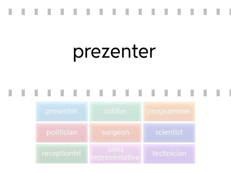 presenter - prezenter, politician - polityk, progeammer - programista, receptionist - recepcjonista, sales representative - przedstawiciel handlowy, scientist - naukowiec, soldier - żołnierz, surgeon - chirurg, technician - technik,