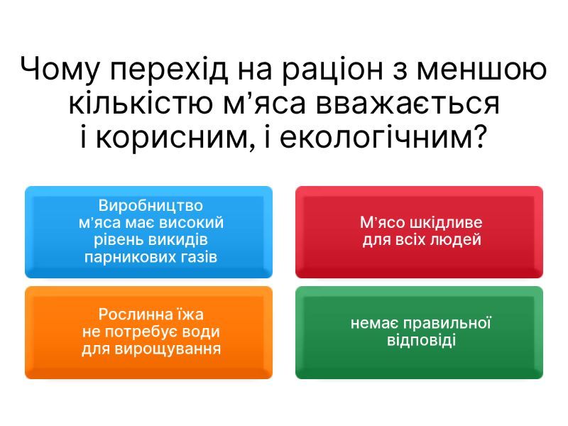 1) Чому перехід на раціон з меншою кількістю м’яса вважається і корисним, і екологічним? a) Виробництво м’яса має високий рівень викидів парникових газів b) М’ясо шкідливе для всіх людей c) Рослинна їжа не потребує води для вирощування d) немає правильної відповіді 2) Чому логічно відмовитися від наркотиків, якщо говорити про екологію? a) Тому що природа "ображається" b) Тому що рослини перестають рости c) Тому що погіршується погода d) Їх виробництво забруднює ґрунт і воду хімікатами 3) Що логічно обрати, якщо хочеш покращити здоров’я і не шкодити природі? a) Спорт лише онлайн без руху b) Тренування з одноразовими пластиковими пляшками c) Тренування на свіжому повітрі d) Тренування в темній кімнаті без вікон 4) Чому використання багаторазових речей вважається частиною екологічно здорового життя? a) Багаторазові речі швидше ламаються b) Воно зменшує кількість відходів і знижує ризик контакту з пластиковими токсинами c) Одноразові речі безпечніші для здоров’я d) Нічого не дає цим 5) Який варіант найменше шкодить довкіллю і водночас покращує здоров’я? a) Обирати маршрутки навіть на 5 хвилин ходьби b) Якщо людина кинула курити, щоПройтися пішки до школи c) Їздити щодня на автомобілі d) Викликати таксі на короткі відстані 6) Якщо людина кинула курити, що логічно станеться? a) Менше токсичних недопалків потраплятиме у природу b) Повітря стане повністю чистим за 1 день c) Ліси почнуть швидше рости d) Озоновий шар повністю відновиться