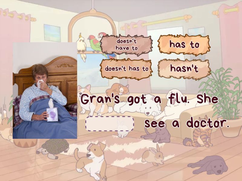 Gran's got a flu. She ____ see a doctor. Emma ____ do the shopping because Gran can't go out today. Poppy is well now. She ____ stay in bed any more. George and Harry's mum is ill. They ____ be quiet at home. Mum ____ see the doctor as Dad can help her! George and Harry ____ study for an important test this week. It's spring holiday. The children ____ get up early in the morning!