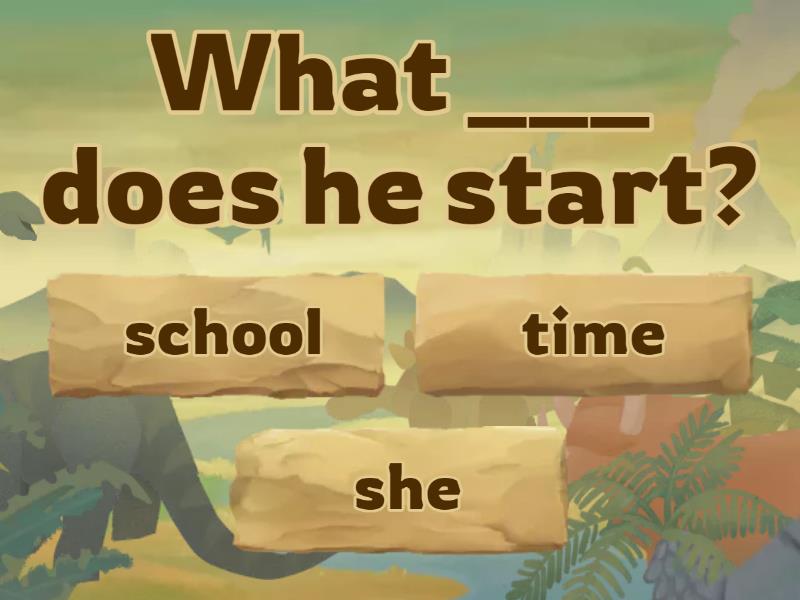 1) Where ___ he live? a) does b) do c) goes 2) What ___  does he go to? a) time b) school c) karate 3) What ___ does he start? a) school b) time c) she 4) What ___ does he do? a) school b) Australia c) sports 5) He ___ in Australia. a) does b) starts c) lives 6) He ___ to Green Park School. a) does b) goes c) plays 7) He ___ at nine o’clock. a) plays b) does c) starts 8) He does ___ . a) karate b) football c) school