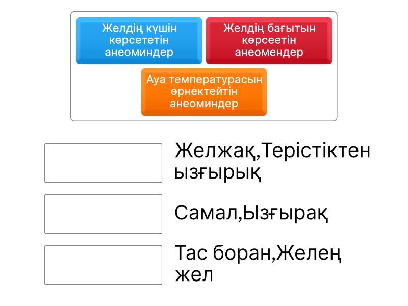 Желдің күшін көрсететін анеоминдер - Тас боран,Желең жел, Ауа температурасын өрнектейтін анеоминдер - Самал,Ызғырақ, Желдің бағытын көрсеетін анеомендер - Желжақ,Терістіктен ызғырық,