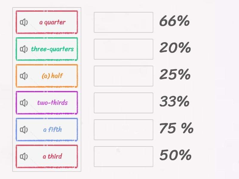 a fifth - 20%, a quarter - 25%, a third - 33%, (a) half - 50%, two-thirds - 66%, three-quarters  - 75 %,