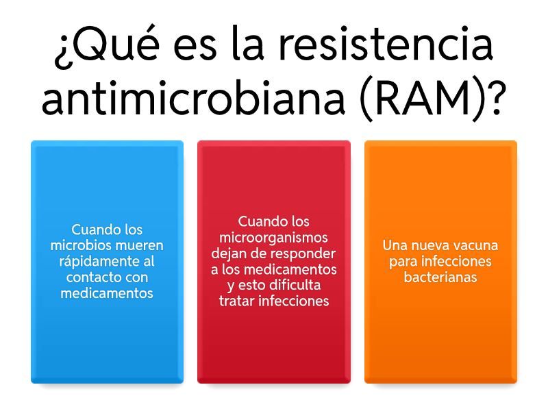 1) ¿Qué es la resistencia antimicrobiana (RAM)? a) Cuando los microbios mueren rápidamente al contacto con medicamentos b) Cuando los microorganismos dejan de responder a los medicamentos y esto dificulta tratar infecciones c) Una nueva vacuna para infecciones bacterianas 2) ¿Cuál es una causa principal del aumento de la resistencia antimicrobiana? a) Uso correcto de medicamentos b) Diagnóstico preciso c) Uso excesivo e incorrecto de antibióticos en animales y humanos 3) Cuál de las siguientes prácticas contribuye a evitar la resistencia antimicrobiana? a) No completar el tratamiento con antibióticos b) Utilizar antibióticos sólo cuando un diagnóstico preciso lo indica c) Compartir antibióticos con otras personas o animales