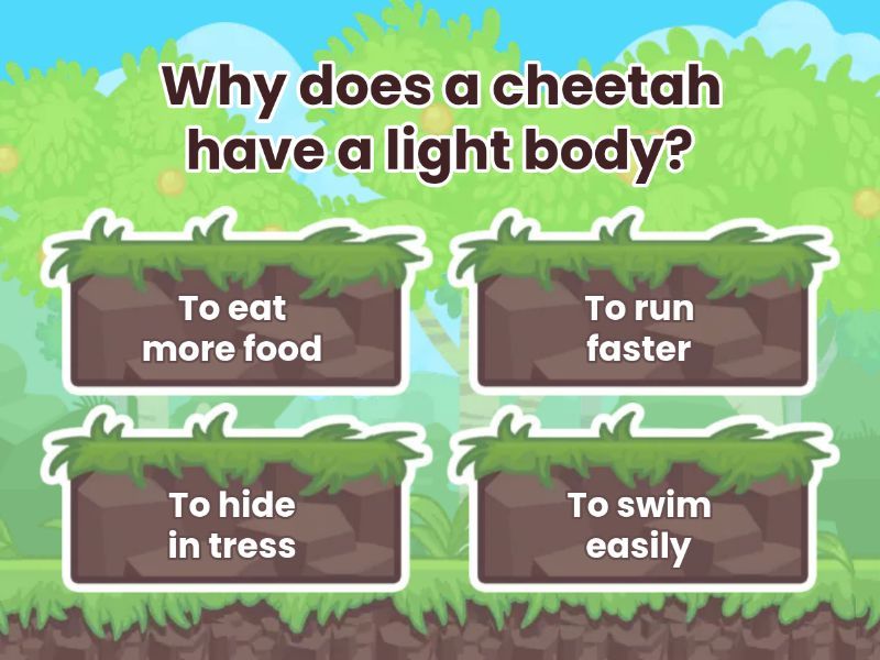 1) Why does a cheetah have a light body? a) To eat more food b) To run faster c) To hide in tress d) To swim easily 2) A koala sleeps for many hours every day. What does this tell us about koalas? a) They are noctural b) They save energy because their food gives little energy c) They can fly d) They are dangerous hunters 3) Why does a zebra black and white stripes? a) To look cute b) To attract insects c) To use camouflage d) To warn predators 4) Why does a camel have a hump filled with fat? a) To swim faster b) To scared predators c) To store energy in the desert d) To keep its fur warm 5) A panda eats bamboo everyday. What does this show? a) It is a carnivore b) It is a herbivore c) It is an omnivore d) It is a predator