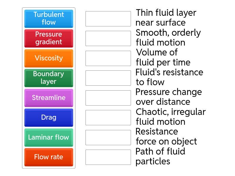 Laminar flow - Smooth, orderly fluid motion, Turbulent flow - Chaotic, irregular fluid motion, Viscosity - Fluid's resistance to flow, Streamline - Path of fluid particles, Boundary layer - Thin fluid layer near surface, Drag - Resistance force on object, Flow rate - Volume of fluid per time, Pressure gradient - Pressure change over distance,