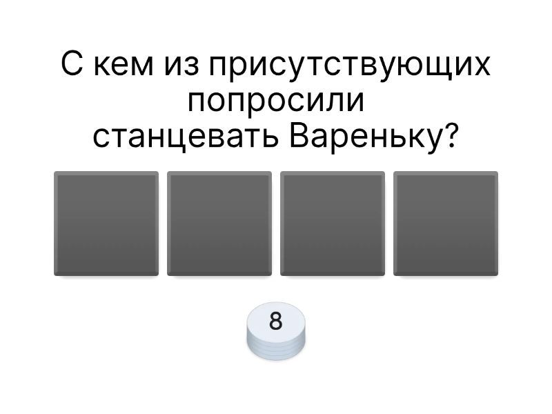 1) С кем из присутствующих попросили станцевать Вареньку? a) Ивана Васильевича b) Петра Владиславовича c) Инженера Анисимова d) Молодого человека 2) Что спрятал Иван Васильевич в перчатку? a) Пёрышко b) Кольцо c) Платочек d) Веер 3) Что отдал полковник молодому человеку перед танцем? a) Кинжал b) Саблю c) Шпагу d) Портупею 4) На какой танец пригласил отец свою дочь? a) Мазурка b) Кадриль c) Вальс d) Полька 5) С кем жил Иван Васильевич? a) С сестрой b) С покойным братом c) С родителями d) С лакеем 6) Как звали лакея? a) Осип b) Савельич c) Петруша d) Степан 7) Кого увидел Иван Васильевич посреди рядов? a) Тюремщика b) Беглого заключённого c) Беглого татарина d) Виновного 8) Чем солдаты избивали татрина? a) Плетью b) Палками c) Дубинками d) Камнями 9) Кого бил полковник по лицу? a) Солдата b) Унтер -офицера 10) Любил ли Иван Васильевич Вареньку? a) Любовь пошла на убыль b) Любил
