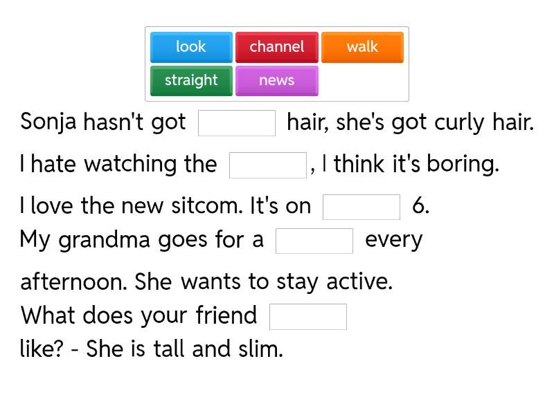Sonja hasn't got ____ hair, she's got curly hair. I hate watching the ____, I think it's boring. I love the new sitcom. It's on ____ 6. My grandma goes for a ____ every afternoon. She wants to stay active. What does your friend ____ like? - She is tall and slim.