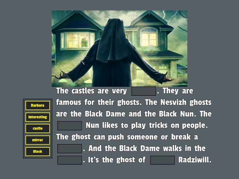 The castles are very ____. They are famous for their ghosts. The Nesvizh ghosts are the Black Dame and the Black Nun. The ____ Nun likes to play tricks on people. The ghost can push someone or break a ____. And the Black Dame walks in the ____. It's the ghost of ____ Radziwill. In old times, ____ called ____ the country of castles. There were ____ km between them. Now there are many places in Belarus where we can still see these old ____. ____ lies in Minsk region. It is one of the ____ towns in Belarus. From the 16th century, it was the residence of a ____ — the Radziwills. There is a ____ to Radziwill-Sirotka in Nesvizh.