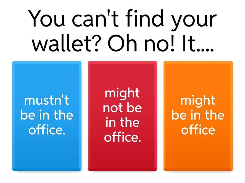 1) You can't find your wallet? Oh no! It.... a) mustn't be in the office. b) might not be in the office. c) might be in the office 2) I don't know Richard well, but he.... a) could not be really nice. b) can't be really nice. c) seems to be really nice 3) I'm really busy, so l ....... a) may come tonight. b) might not come tonight. c) must come tonight. 4) He's been in bed all day. He.... a) can't be tired b) can be tired c) must feel bed 5) They aren't answering the door. They.... a) can't be out b) seem be out c) may be out 6) Alex always looks smart and fashionable. He.... a) must have a good job. b) can't have a good job. c) can have a good job. 7) Why don't we go to the party at the weekend? It.... a) could be a lot of fun. b) can't be a lot of fun. c) may not be a lot of fun. 8) That group of people are speaking Spanish. I'm not sure, but they... a) can't be from Argentina. b) must be from Argentina. c) may be from Argentina.