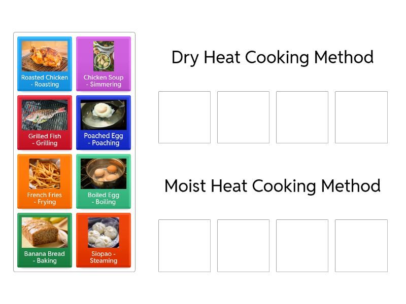 Dry Heat Cooking Method: French Fries - Frying, Banana Bread - Baking, Roasted Chicken - Roasting, Grilled Fish - Grilling, Moist Heat Cooking Method: Boiled Egg - Boiling, Siopao - Steaming, Chicken Soup - Simmering, Poached Egg - Poaching,
