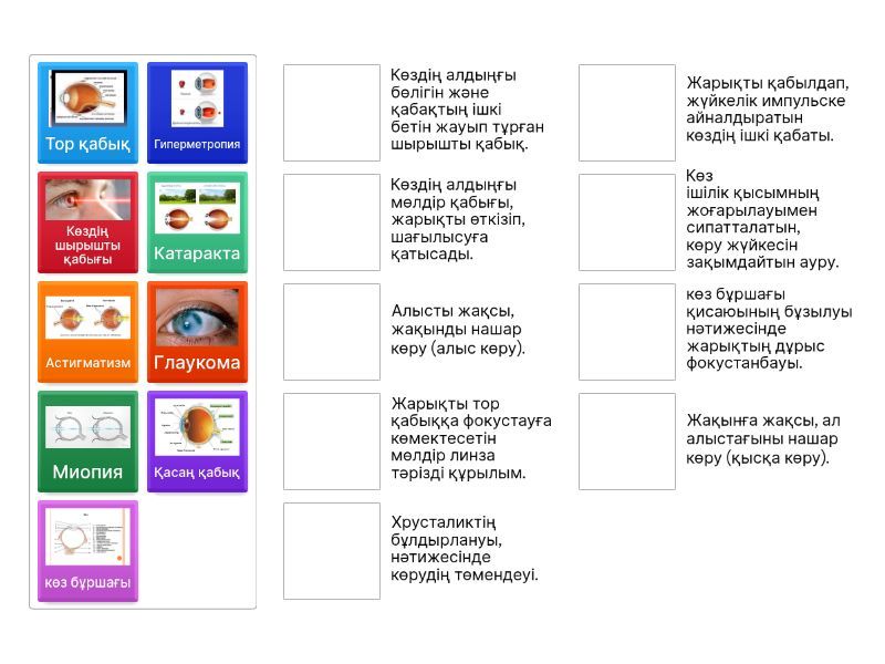 Қасаң қабық - Көздің алдыңғы мөлдір қабығы, жарықты өткізіп, шағылысуға қатысады., Көздің шырышты қабығы - Көздің алдыңғы бөлігін және қабақтың ішкі бетін жауып тұрған шырышты қабық., көз бұршағы - Жарықты тор қабыққа фокустауға көмектесетін мөлдір линза тәрізді құрылым., Тор қабық - Жарықты қабылдап, жүйкелік импульске айналдыратын көздің ішкі қабаты., Глаукома - Көз ішілік қысымның жоғарылауымен сипатталатын, көру жүйкесін зақымдайтын ауру., Катаракта - Хрусталиктің бұлдырлануы, нәтижесінде көрудің төмендеуі., Миопия - Жақынға жақсы, ал алыстағыны нашар көру (қысқа көру)., Гиперметропия - Алысты жақсы, жақынды нашар көру (алыс көру)., Астигматизм - көз бұршағы қисаюының бұзылуы нәтижесінде жарықтың дұрыс фокустанбауы.,