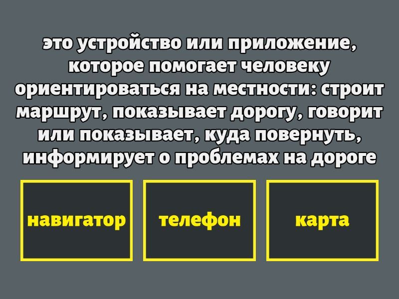 1) это устройство или приложение, которое помогает человеку ориентироваться на местности: строит маршрут, показывает дорогу, говорит или показывает, куда повернуть, информирует о проблемах на дороге a) навигатор b) телефон c) карта 2) это путь, по которому нужно идти или ехать от одного места к другому a) дорога b) пешеходный переход c) маршрут 3) это место, куда нужно приехать или куда идёт человек. Это финальная цель маршрута a) домой b) пункт назначения c) на работу 4) это значит ошибиться с местом, куда нужно прийти или доставить что-то a) перепутать адрес b) сказать "Извините!" c) позвонить 5) это ситуация на дороге, когда машины едут очень медленно или стоят на месте из-за большого количества транспорта a) едет полиция b) дождь c) пробка 6) это значит оставаться где-то дольше, чем планировалось или не уходить вовремя a) задерживаться b) опаздывать c) ждать 7) это жидкость, которая нужна для работы машины или других механизмов a) кола b) бензин c) вода 8) это место, где можно налить бензин или дизель в машину a) кафе b) заправка c) сервисный центр 9) это место, где ремонтируют, проверяют и обслуживают машины, чтобы они работали правильно a) СТО b) почта c) гараж 10) это дыра в шине, там из неё выходит воздух a) ремонт колеса b) акселератор c) прокол колеса 11) это наречие, которое обозначает необходимость сделать что-то максимально быстро, в короткий срок a) нормально b) медленно c) срочно