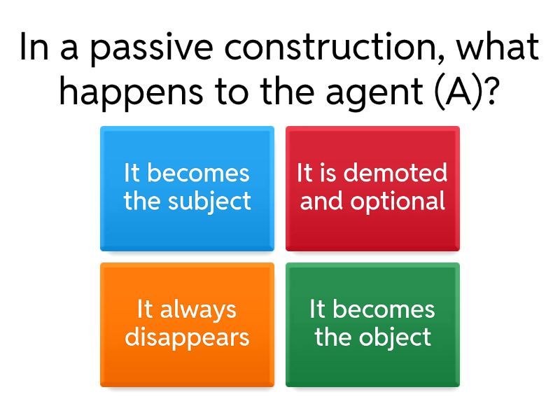 1) In a passive construction, what happens to the agent (A)? a) It becomes the subject b) It is demoted and optional c) It always disappears d) It becomes the object 2) Which construction increases valency? a) Causative b) Reflexive c) Passive d) None of the above 3) Which sentence contains an applicative? a) The cake was eaten b) She got him to leave c) She baked her sister a cake d) The door was opened 4) In a causative, the original subject becomes: a) A new subject b) A by-phrase c) An oblique d) An object (causee) 5) Which process decreases valency? a) Applicative b) Passive c) Causative d) None 6) Which best describes “promotion”? a) Removing an argument b) Adding a new argument c) Moving an argument to prominence d) Marking an argument with case 7) In “The girl was seen by the boy,” which role is the subject? a) A b) S c) O d) O promoted to S 8) Which construction adds a new causer argument? a) Passive b) Causative c) Applicative d) Intransitive reduction 9) Which sentence shows valency unchanged? a) The cat chased the mouse b) The man was arrested c) She made him run d) She wrote her sister a letter 10) Applicatives typically promote: a) The agent b) An oblique argument c) The object d) The subject
