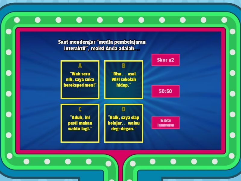 1) Saat mendengar “media pembelajaran interaktif”, reaksi Anda adalah… a) “Wah seru nih, saya suka bereksperimen!” b) “Bisa… asal WiFi sekolah hidup.” c) “Aduh, ini pasti makan waktu lagi.” d) “Baik, saya siap belajar… walau deg-degan.” 2) Media yang paling sering Anda pakai di kelas adalah… a) PowerPoint — template 2017 tapi masih setia b) Video YouTube — kalau sinyal tidak mogok c) Wordwall/Kahoot — penyelamat saat kelas mulai ngantuk d) Papan tulis — spidol tidak pernah minta update 3) Tantangan terbesar saat membuat media pembelajaran adalah… a) Ide ada… waktu yang tidak ada b) Laptop ngambek pas mau disimpan c) Murid bilang: “Bu, aku nggak bisa klik!” d) Tombolnya hilang… padahal kemarin ada 4) Menurut Anda, murid paling semangat kalau… a) Ada poin dan skor b) Ada suara “YEAY!” atau animasi lucu c) Gurunya pakai media baru d) Semua di atas benar (dan bikin guru capek bahagia) 5) Pilih yang paling menggambarkan Anda: a) Guru yang siap berevolusi seperti teknologi b) Guru yang semangat… tapi sering lupa password c) Guru yang mau belajar, tapi butuh tutorial singkat d) Guru yang: “Asal anak paham, medianya ayok!”