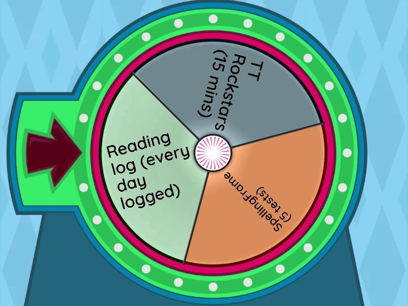 1) TT Rockstars (15 mins) 2) SpellingFrame (5 tests) 3) Reading log (every day logged)