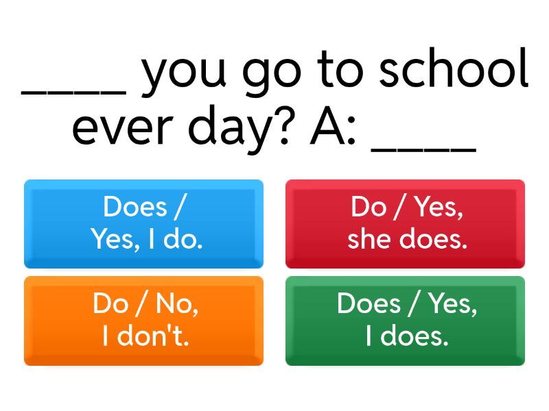 1) ____ you go to school ever day? A: ____ a) Does / Yes, I do. b) Do / Yes, she does. c) Do / No, I don't. d) Does / Yes, I does. 2) ____ she cook well? Yes, she ____ a) Does / does b) Do/ does c) Does / do d) Do / do 3) _____ they play the piano? No, they ____. a) Does / don't b) Does / doesn't c) Do / don't d) Do/ do 4) _____ you read many books? Yes, I ___. a) Do / do b) Does / does c) Do / don't 5) _____ he work near here? No, he ______. a) Does / don't b) Does / does c) Do / don't d) Does / doesn't 6) _______'s your favourite football team? a) Who b) What c) Where d) Why 7) ____'s your favourite football player? a) What b) Who c) Where d) Why 8) _____ do you live? a) Where b) What c) Who d) How 9) ____ often do you play volleyball? a) What b) Who c) Where d) How 10) Where _____ she work? a) do b) does 11) How often _____ Paul and Anna go to the cinema? a) do b) does 12) When ____ your birthday? a) do b) does c) is d) are 13) What colour ____ your eyes? a) do b) does c) is d) are 14) Who_____ your favourite singer? a) do b) does c) is d) are 15) Why _____ you sad? a) is b) are c) do d) does