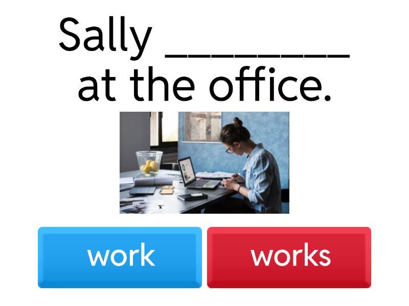 1) Sally ________ at the office. a) work b) works 2) Jeaun and Lui ________French. a) speak b) speaks 3) She_______ in a pool twice a week. a) swims b) swim 4) They always ________ breakfast together. a) has b) have 5) Camila ________ 6 hours a day.She is always tired. a) sleeps b) sleep 6) Mat ________ rollercoasters every summer when he_______ Florida. a) rides/visits b) ride/visit 7) Marta ________ shopping with her friends every weekends. a) goes b) go 8) Mrs.Parker often _______ pies and cakes. a) bakes b) bake 9) My friends _______in the mountains every spring. a) hikes b) hike 10) Our grandpa seldom_________ on the computer. He usually _____ us to help him. a) works/ asks b) work/ask 11) Jake never ________ TV at night. a) watches b) watch 12) He ______ to work every morning. Sometimes he ______ long hours in the traffic jam. a) goes/ spends b) go/spend 13) Our cousin Nick often ___________ at the Nort pole. He is an explorer. a) lives b) live 14) My groupmates sometimes _________ together and ______ in karaoke. a) gather/ sing b) gathers/sings 15) Patric often _______ his mum to wash dishes. a) helps b) help 16) They _________ their dog 3 times a day. a) feed b) feeds