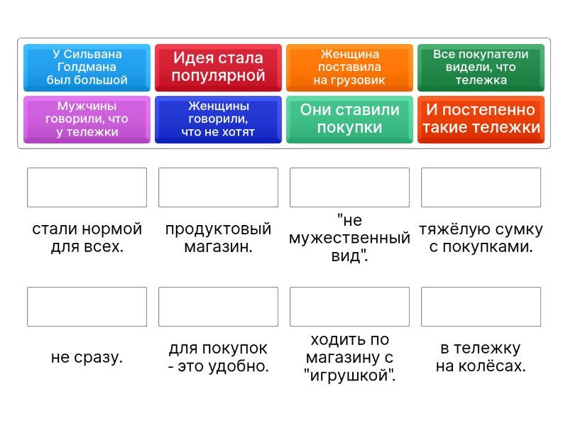 У Сильвана Голдмана был большой - продуктовый магазин., Клиенты покупали столько продуктов, - сколько могли унести в руках., Однажды Голдман увидел в магазине - женщину с ребёнком., У ребёнка был игрушечный - грузовик с колёсами., Женщина поставила на грузовик - тяжёлую сумку с покупками., Ребёнок с удовольствием - катил грузовик на верёвочке., Сильван Голдман взял - корзину и поставил её на колёса., Идея стала популярной - не сразу., Женщины говорили, что не хотят - ходить по магазину с "игрушкой"., Мужчины говорили, что у тележки - "не мужественный вид"., Сильван Голдман нашёл - актёров., Актёры делали вид, - что покупают продукты., Они ставили покупки - в тележку на колёсах., Все покупатели видели, что тележка - для покупок - это удобно., И постепенно такие тележки - стали нормой для всех.,