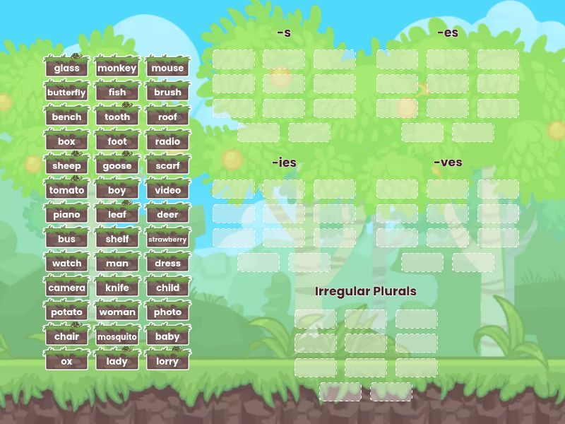 -s: camera, video, radio, piano, boy, chair, photo, roof, monkey, -es: bus, brush, box, glass, watch, potato, mosquito, bench, dress, tomato, -ies: butterfly, lorry, lady, baby, strawberry, -ves: leaf, knife, scarf, shelf, Irregular Plurals: man, foot, goose, tooth, woman, child, sheep, fish, deer, mouse, ox,
